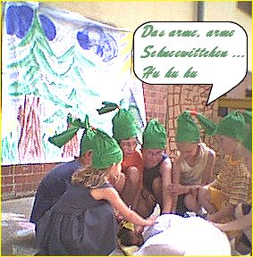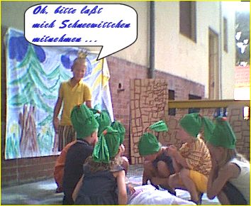 Aber es nahm ein gutes Ende. Ein Prinz kam und wollte Schneewittchen mitnehmen. Durch die Erschütterung löste sich das vergiftete Apfelstückchen aus dem Hals und das Mädchen erwachte. Nun leben Sie alle glücklich und zufrieden auf dem Schloß des Prinzen.